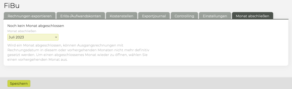 Im Menü FiBU gibt es einen Reiter “Monat abschliessen”. Zusätzlich kann konfiguriert werden, ob sich das Abschliessen der Monate auf Ausgangsrechnungen, Eingangsrechnungen oder beides auswirken soll.